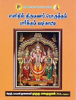 எளிதில் திருமணப் பொருத்தம் பார்க்கும் வழிகாட்டி,இந்தப் புத்தகம் தினப் பொருத்தம், கணப் பொருத்தம், யோனிப் பொருத்தம் போன்ற 10 முக்கியப் பொருத்தங்களை எளிமையாகப் புரிந்துகொள்ள உதவுகிறது. திருமணப் பொருத்தத்தில் தினப் பொருத்தம், யோனிப் பொருத்தம், ரஜ்ஜு பொருத்தம், கணப் பொருத்தம் போன்ற 10 பொருத்தங்கள் மிக முக்கியமானவை, இவற்றை ஆராய்ந்தே திருமணம் செய்ய வேண்டும் என்று ஜோதிட வல்லுநர்கள் தெரிவிக்கின்றனர்