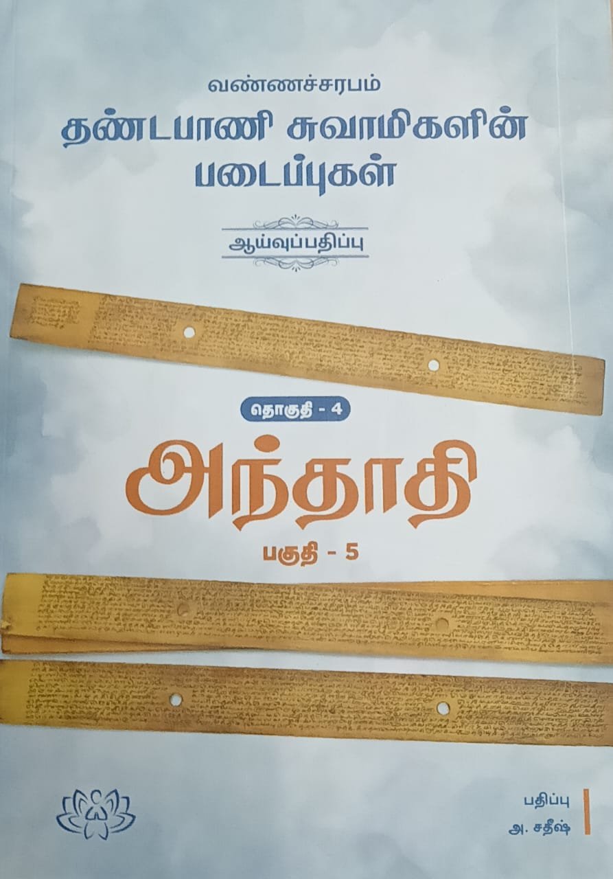"தண்டபாணி சுவாமிகள் படைப்புகள் [தொகுதி - 5] என்ற நூல் முனைவர் அ. சதீஷ் என்பவரால் தொகுக்கப்பட்டு வெளியிடப்பட்டுள்ளது. இந்த நூலில், தண்டபா வ ணி சுவாமிகளின் அந்தாதி, சதகம், உலா, பதிகம் போன்ற பல்வேறு இலக்கியப் பவண்ணச்சரபம் தண்டபாணி சுவாமிகளின் படைப்புகளின் முதடைப்புகள் அடங்கும்.